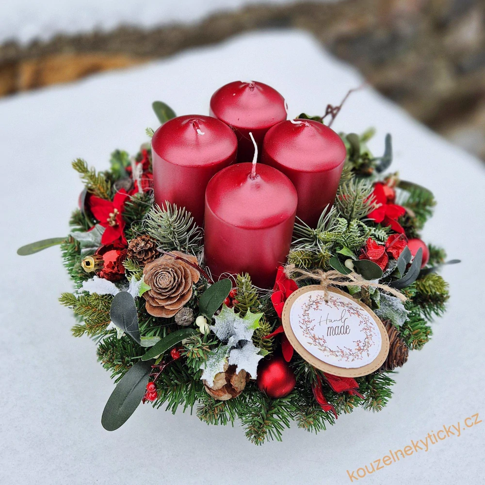 Adventní věnec / umělý / - červený - svíčky metalíza