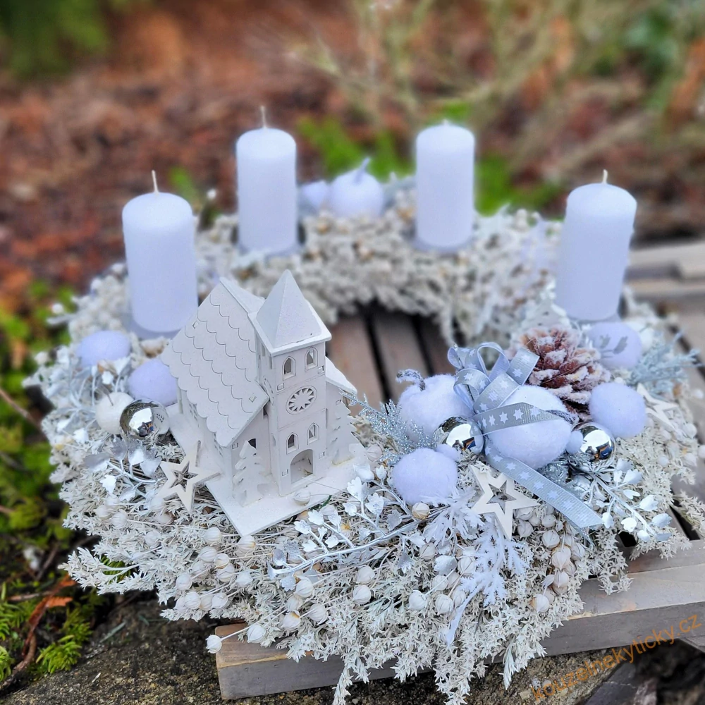 Adventní věnec - Zasněžená krajinka s kostelíkem ena