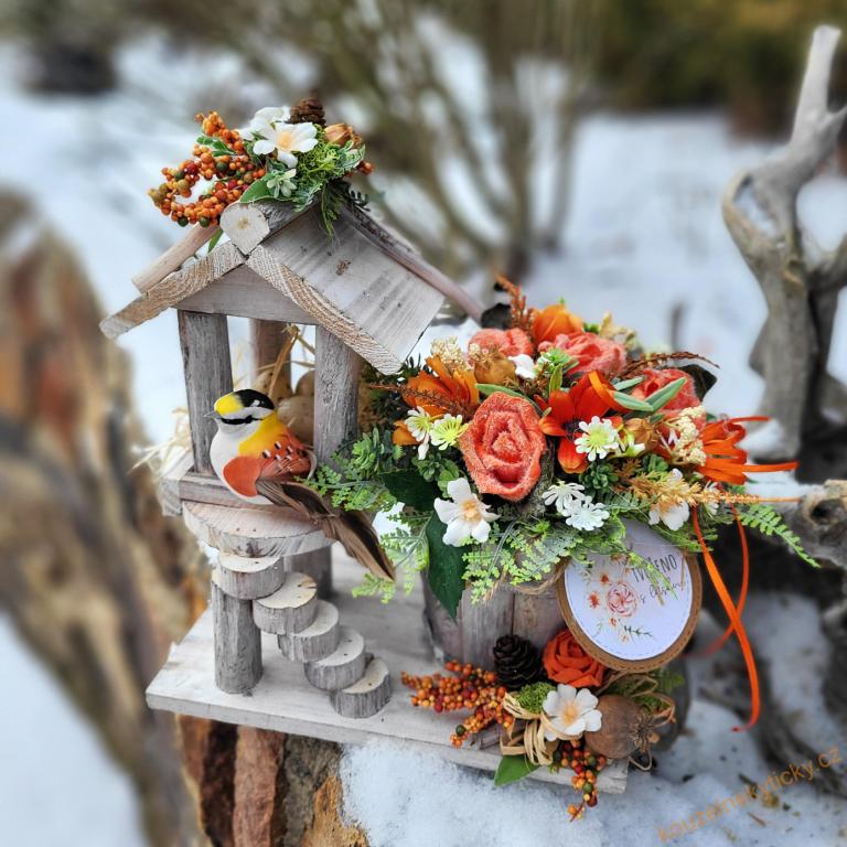 Dekorace - krmítko s ptáčkem a květináčem II.