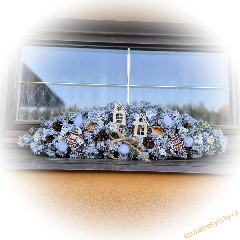 vánoční zasněžená girlanda, umělá, zdobená do tradična, přírodní barvičky, domečky, perníčky