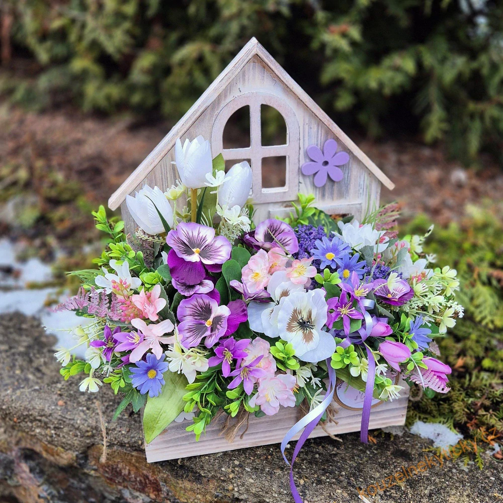 Dřevěný domeček je zdoben jemnými jarními květinami, které přinášejí do vašeho prostoru nádech přírodní krásy. Každý květ vypadá, jako by právě vykvetl na paprscích jarního sluníčka.