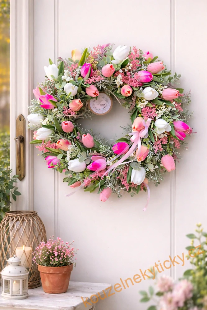 Jarní tulipánový věnec - Růžovo-bílé tóny