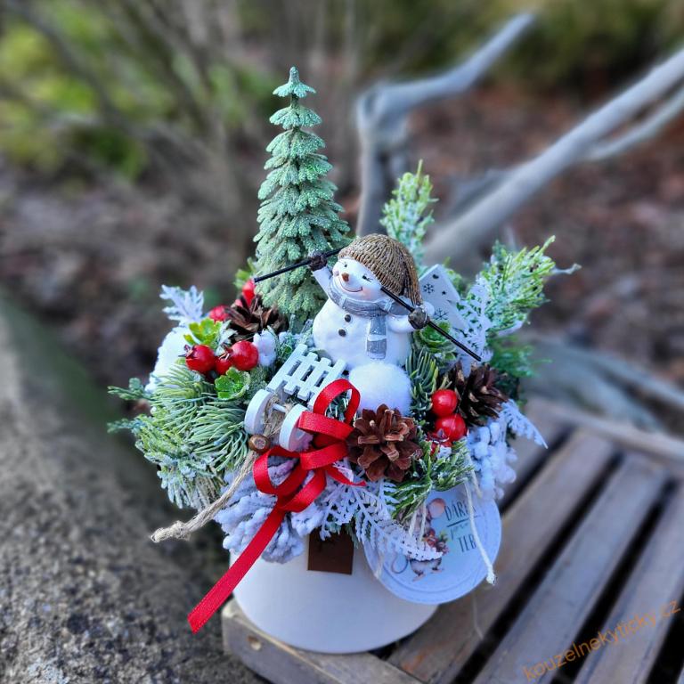 Keramický ušatý květníček se sněhuláčkem - červený