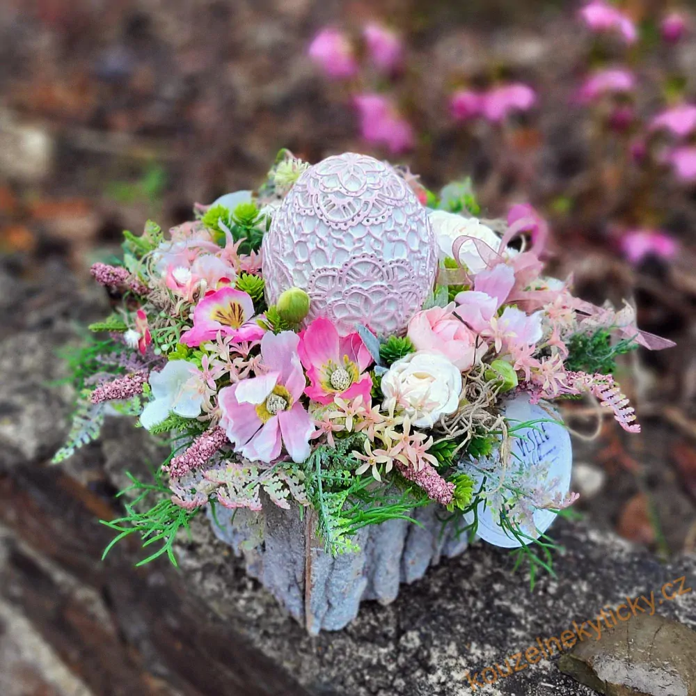 Kůrový, čtvercový květníček s polyresinovým krajkovým vejcem, látkovými květinkami. Rozměr - šířka 23cm, výška 24cm.