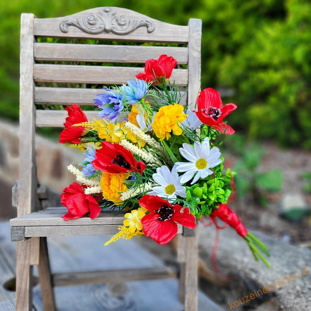 Květinová kytice , vázaná. Všechny kvítky kvalitní, imitace pravých květinek, letních máků , kopretin, zvonků atd. Odolná povětrnostním vlivům a trvanlivá. Šířka 28cm, výška 40cm