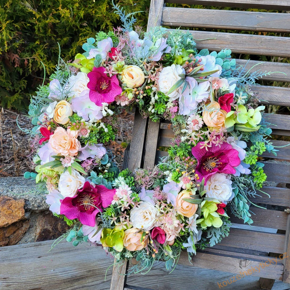 Věnec vázaný z umělých kvítků a umělé zeleně, na slaměnném korpusu. Průměr 34cm. Bohatý, trvanlivý.