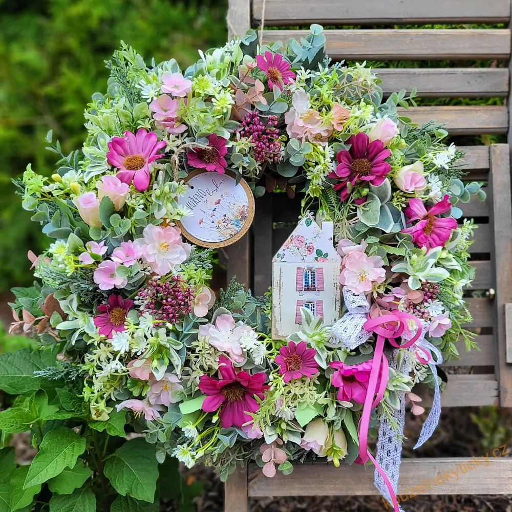Celokvětinový věneček v kombinaci umělé zeleně a autenticky vypadajících látkových květin. Průměr 38cm