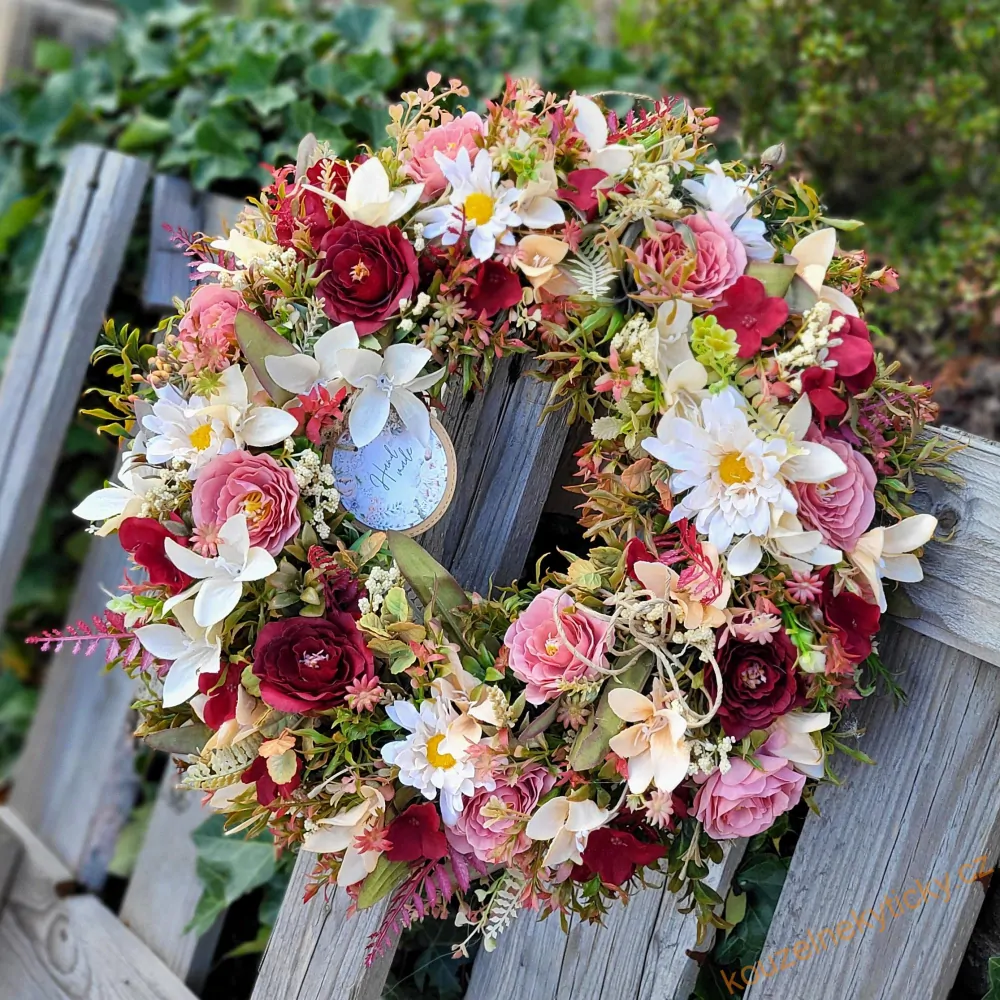 Celokvětinový věneček v kombinaci umělé zeleně a autenticky vypadajících látkových květin. Průměr 38-40cm