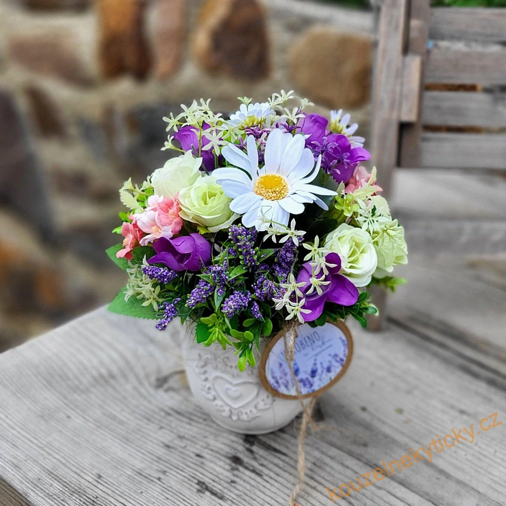 Letní či celoroční dekorace v keramickém květníčku . Kvítky i zeleň jsou umělé a trvanlivé.