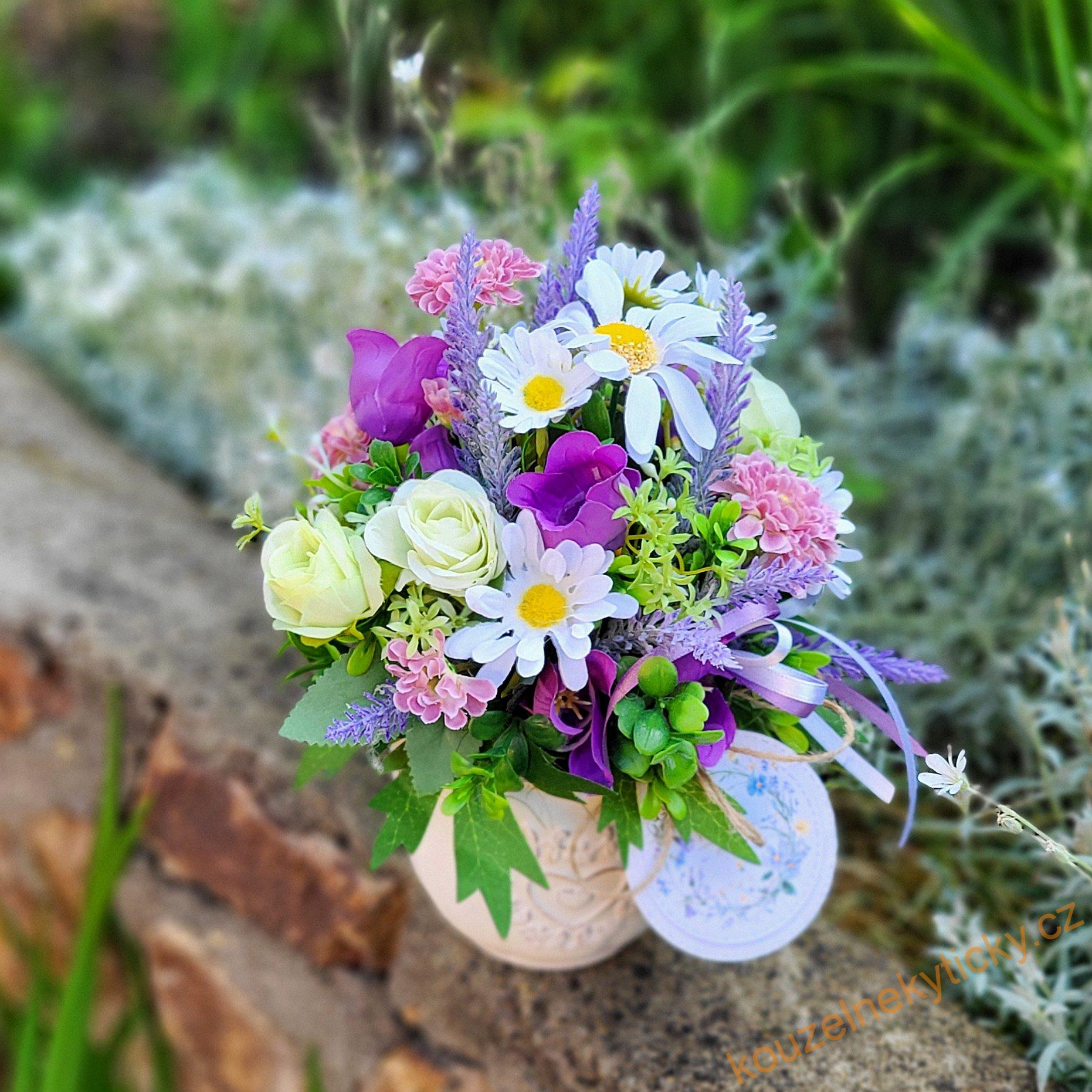 Letní či celoroční dekorace v keramickém květníčku . Kvítky i zeleň jsou umělé a trvanlivé.