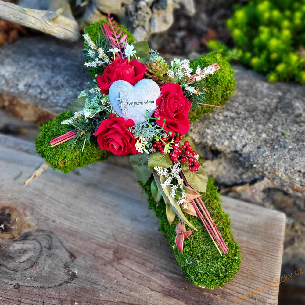 Mechový křížek velikost L - Červené růžičky Noblesa