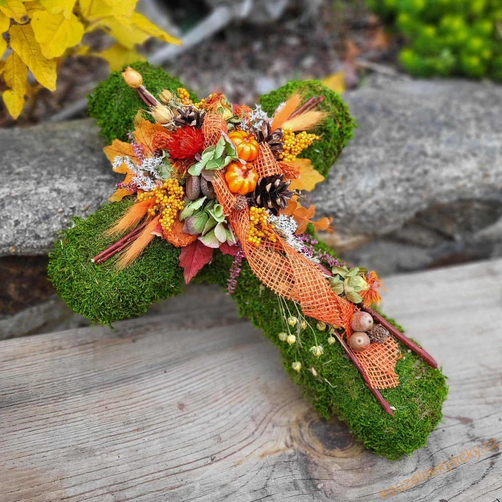 Mechový křížek , dušičkový , větší , zdobený sušenými květinami a plody. Rozměr délka 40 cm.