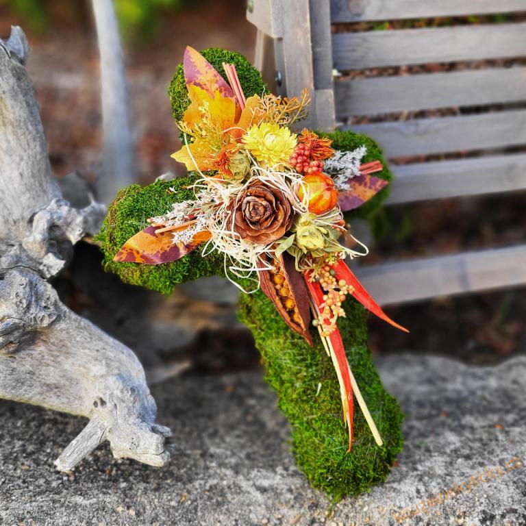 Mechový křížek , dušičkový , menší, zdobený sušenými i umělými květinami. Rozměr délka 30cm.