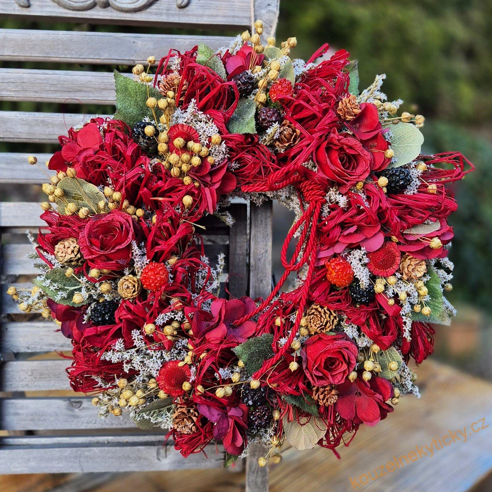 Měnší věnec sušinový - Rudé růžičky s ostružinami a malinamiSkladem 1 ks835,0 Kč/ ks