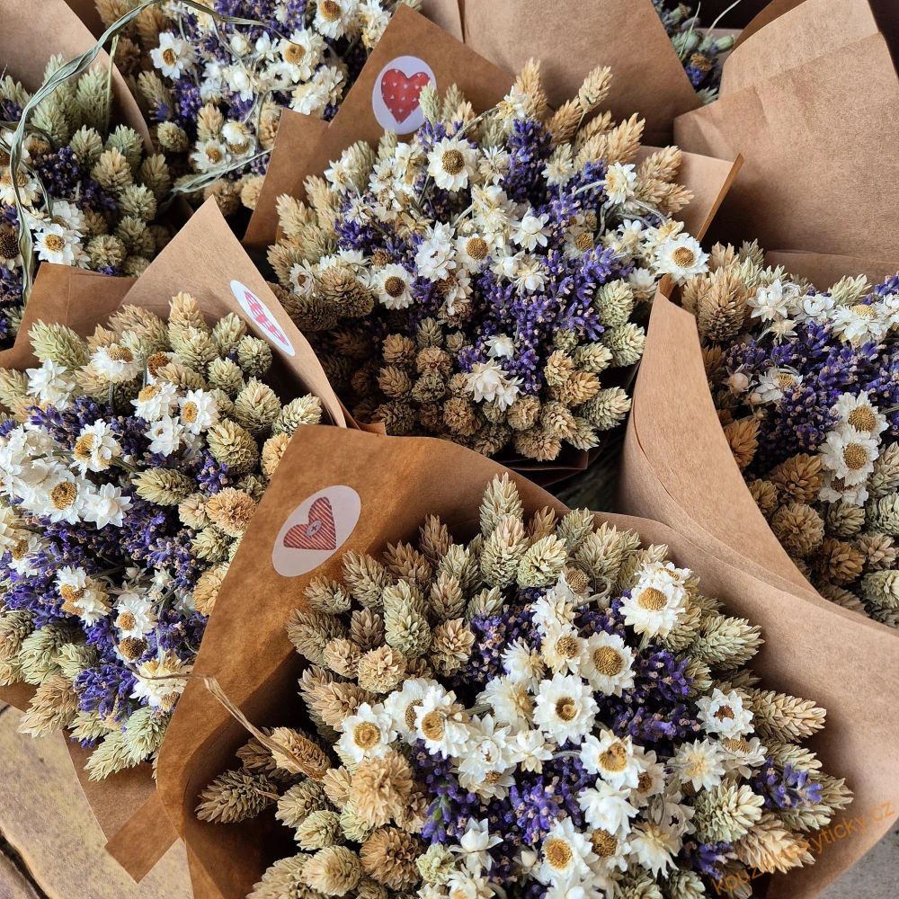 Kytička sušené levandule v kombinaci s dalšími sušenými kvítky viz foto. Zabaleno dárkově v natur papíru. šířka pugétku 15cm, výška celková 30cm.