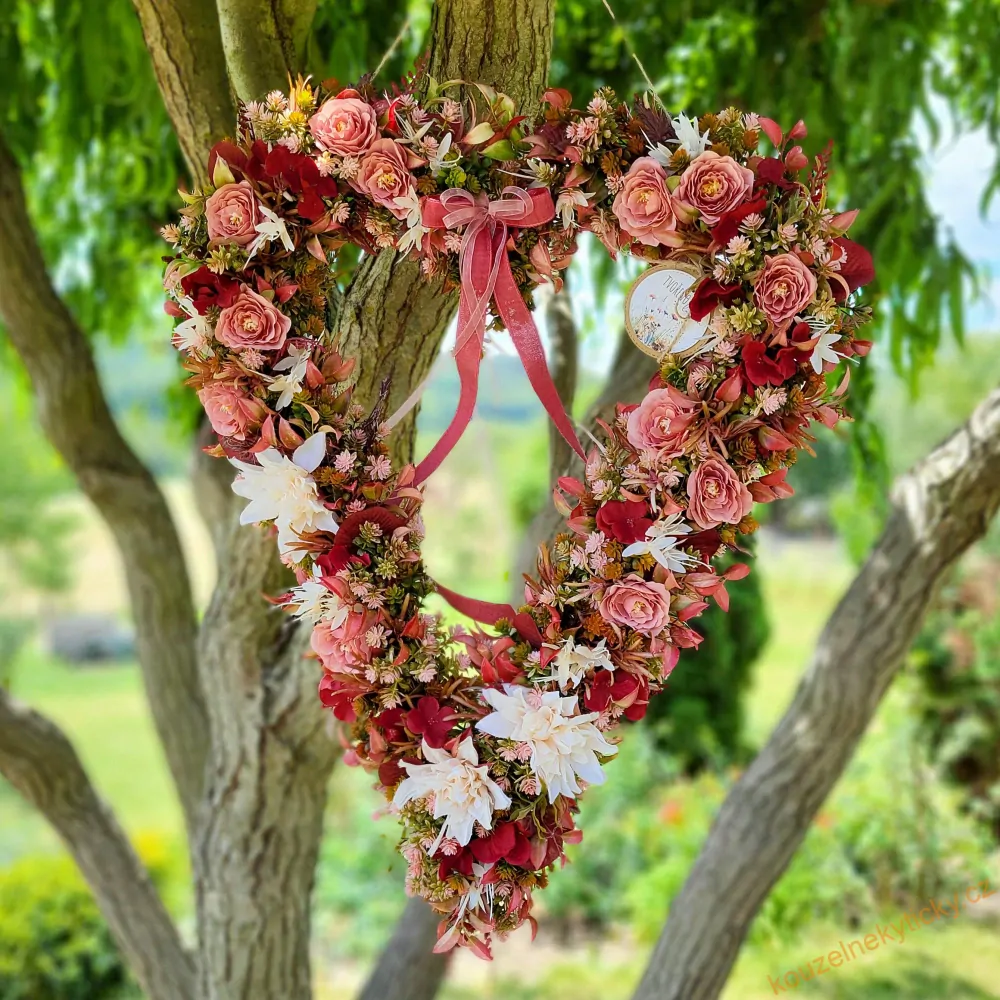 Velké podlouhlé srdce vázané z umělých květinek, takže odolné povětrnostním vlivům a velmi trvanlivé. Krásný kousek do Vašeho interiéru i exteriéru.