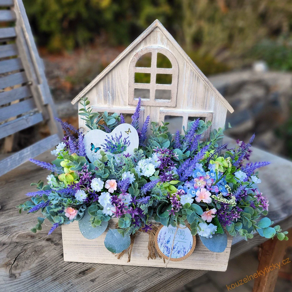 Dřevěný domeček zdobený trvanlivými kvítky v levandulovém stylu . Rozměr - šířka 40cm, výška 42cm, hloubka 20cm