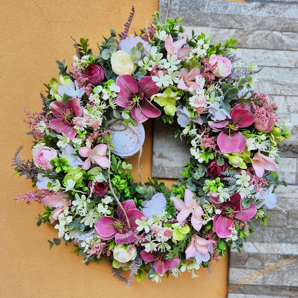 Věnec vázaný z umělých kvítků a umělé zeleně, na slaměnném korpusu. Průměr 40cm. Bohatý, trvanlivý.