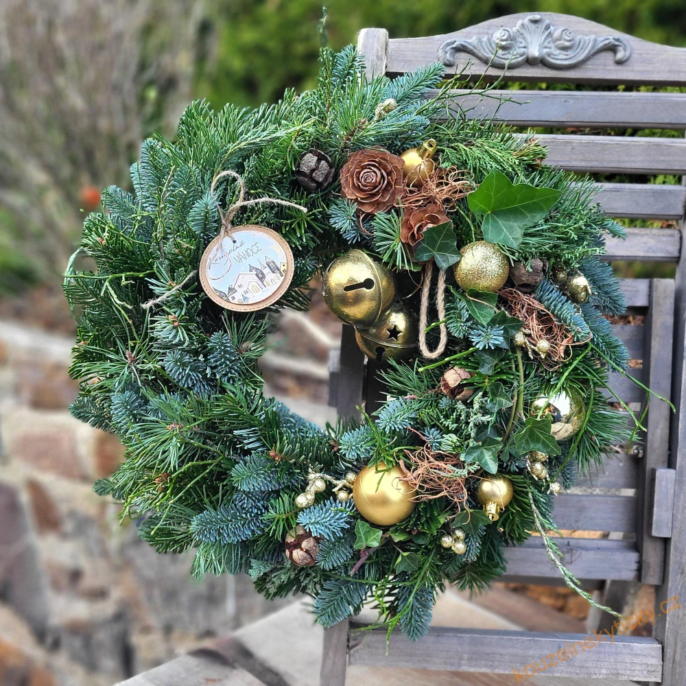 Ručně vázaný , bohatý věnec z různých druhů chvoje a přírodnin viz foto, v detailech a přízdobách se může každý kus lišit, styl a barvy zůstávají zachovány . Průměr 40cm Na přání možno i se stříbrnými zvonci.