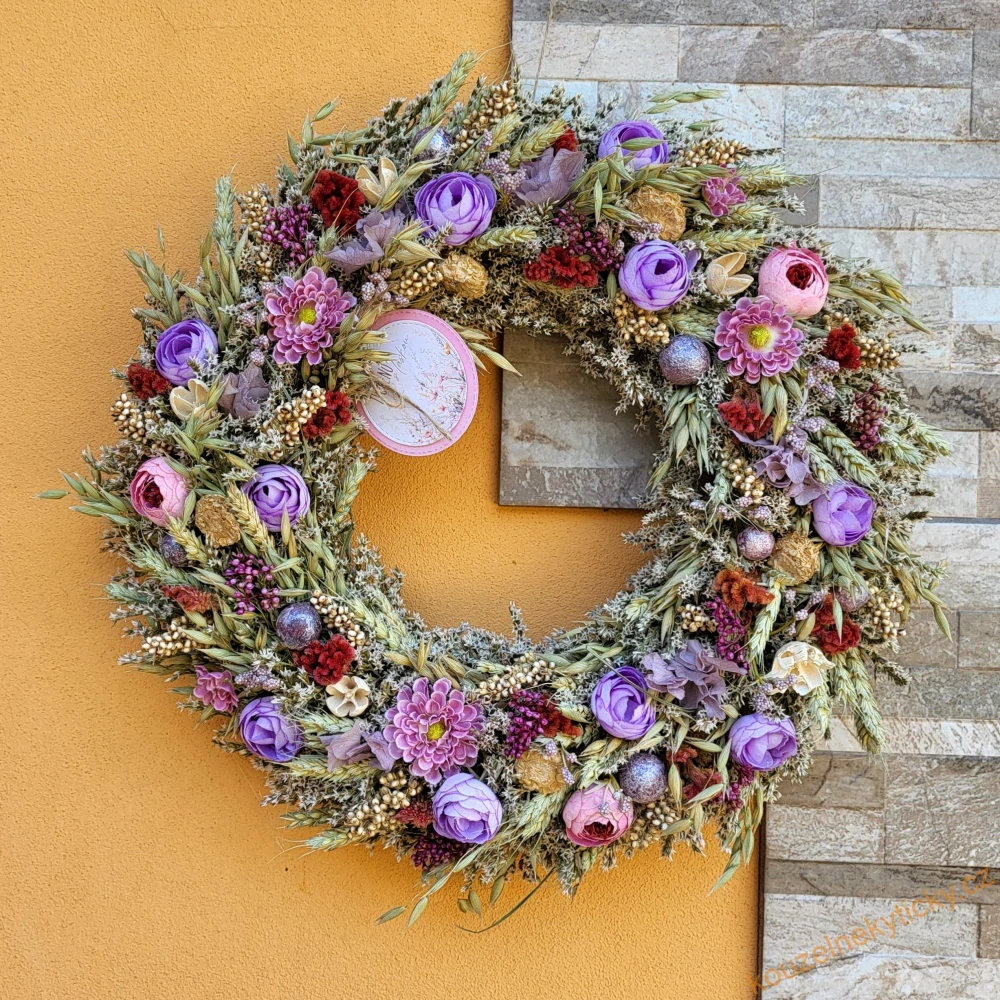 Věnec v kombinaci přírodních materiálů i sušených květin . Průměr 38-40cm, má očko pro zavěšení.