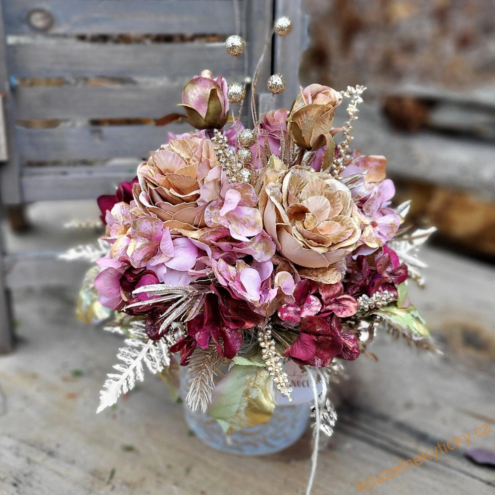 Květinová vánoční aranž v plechové nádobě / zlato/bílé/ , kvalitní látkové luxusní květy se zlatým nádechem jak růže, tak hortenzie. Průměr dekorace 25cm, výška 30cm