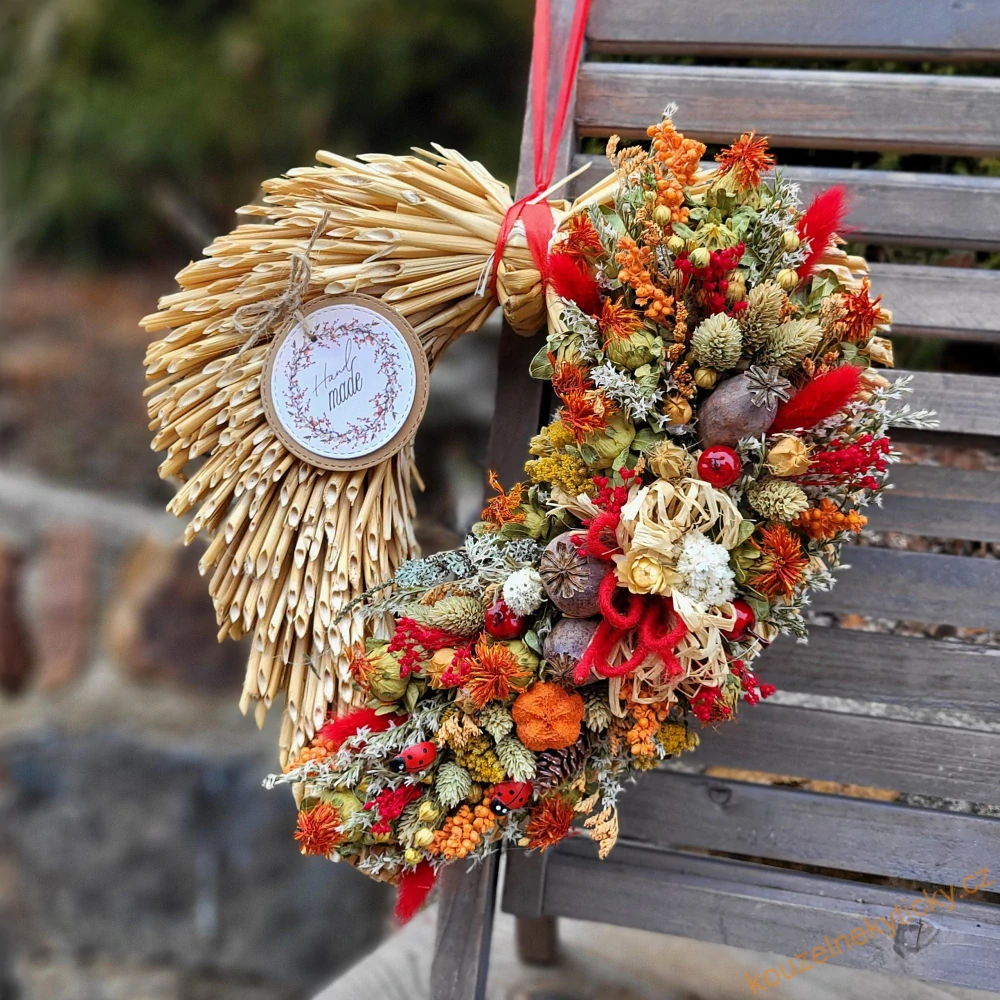 Srdíčko ze střihaných stébel slámy, zdobené sušenými kvítky.
