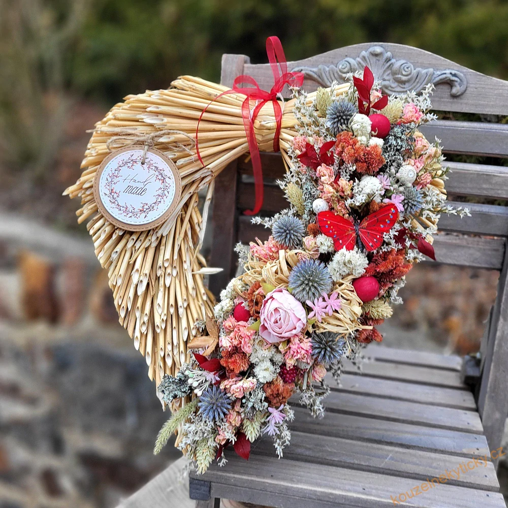 Srdíčko ze střihaných stébel slámy, zdobené sušenými kvítky.