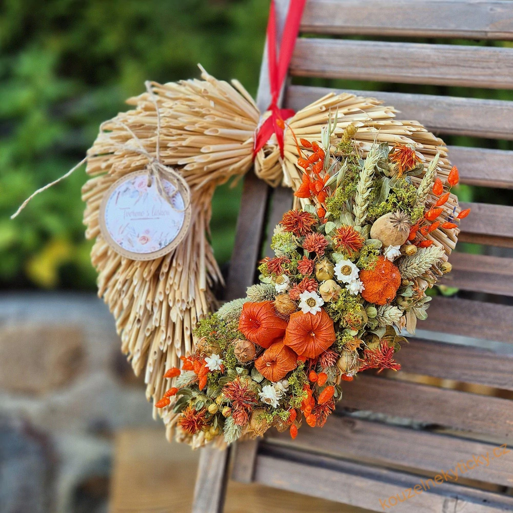 Srdíčko ze střihaných stébel slámy, zdobené sušenými kvítky.