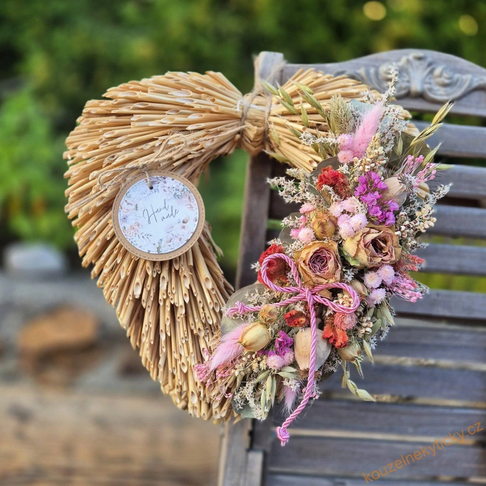 Srdíčko ze střihaných stébel slámy, zdobené sušenými kvítky.