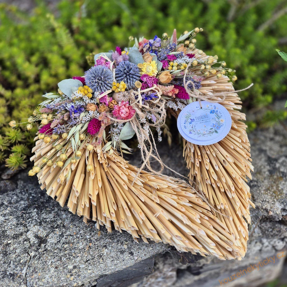Srdíčko ze střihaných stébel slámy, zdobené sušenými kvítky.
