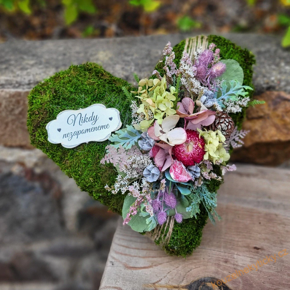 Mechové srdíčko, sušený barvený mech, zdobený viz foto, dřevěnou ceduličkou . Rozměr 27*27cm