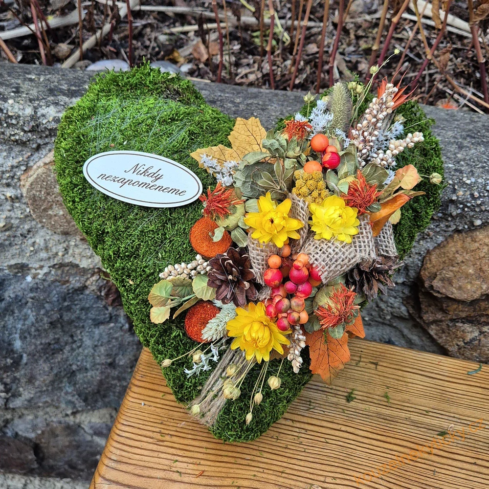 Mechové srdíčko, sušený barvený mech, zdobený viz foto, dřevěnou ceduličkou . Rozměr 27*27cm