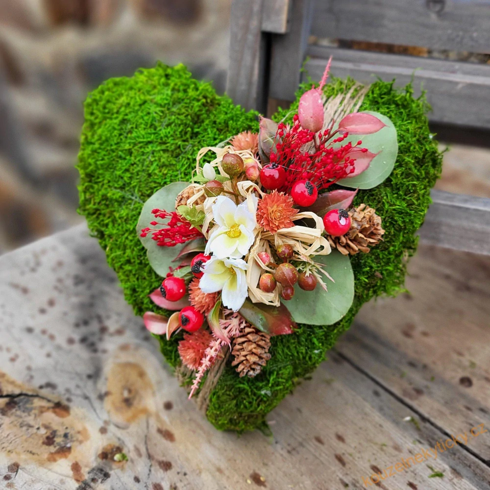 Mechové srdíčko, sušený barvený mech, zdobený viz foto . Rozměr 22*22cm