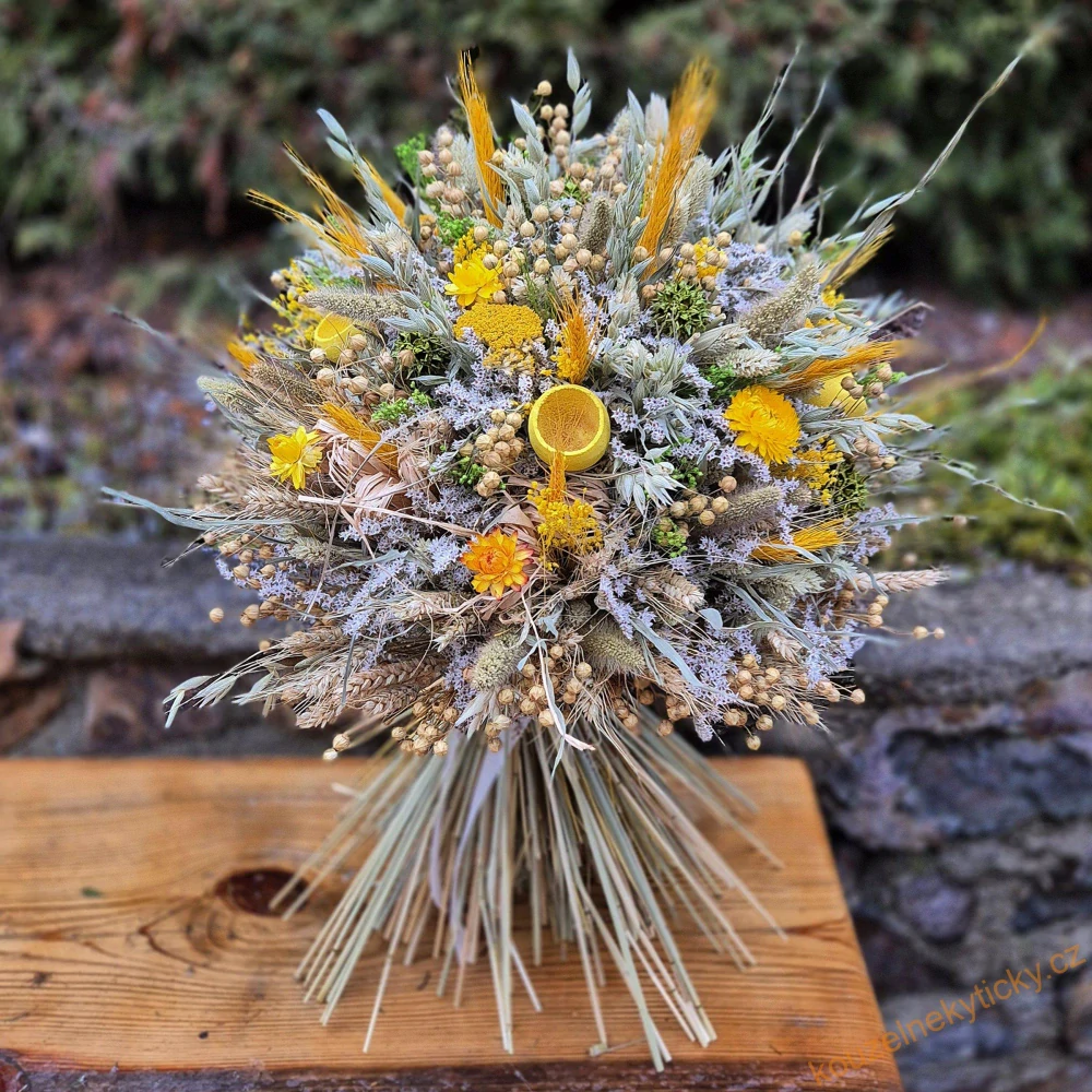 Kytice ze sušených travin a květin, zdobená viz foto.