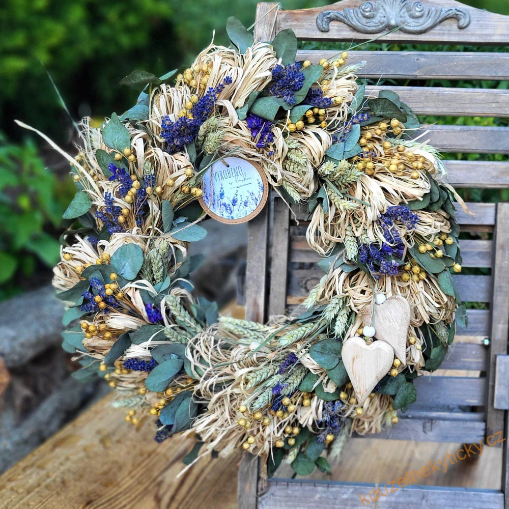 Věnec v kombinaci přírodních materiálů . Průměr 38-40cm, má očko pro zavěšení.