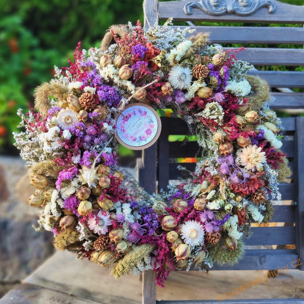 Věnec ze sušených kvítků . Průměr 38-40cm, má očko pro zavěšení.