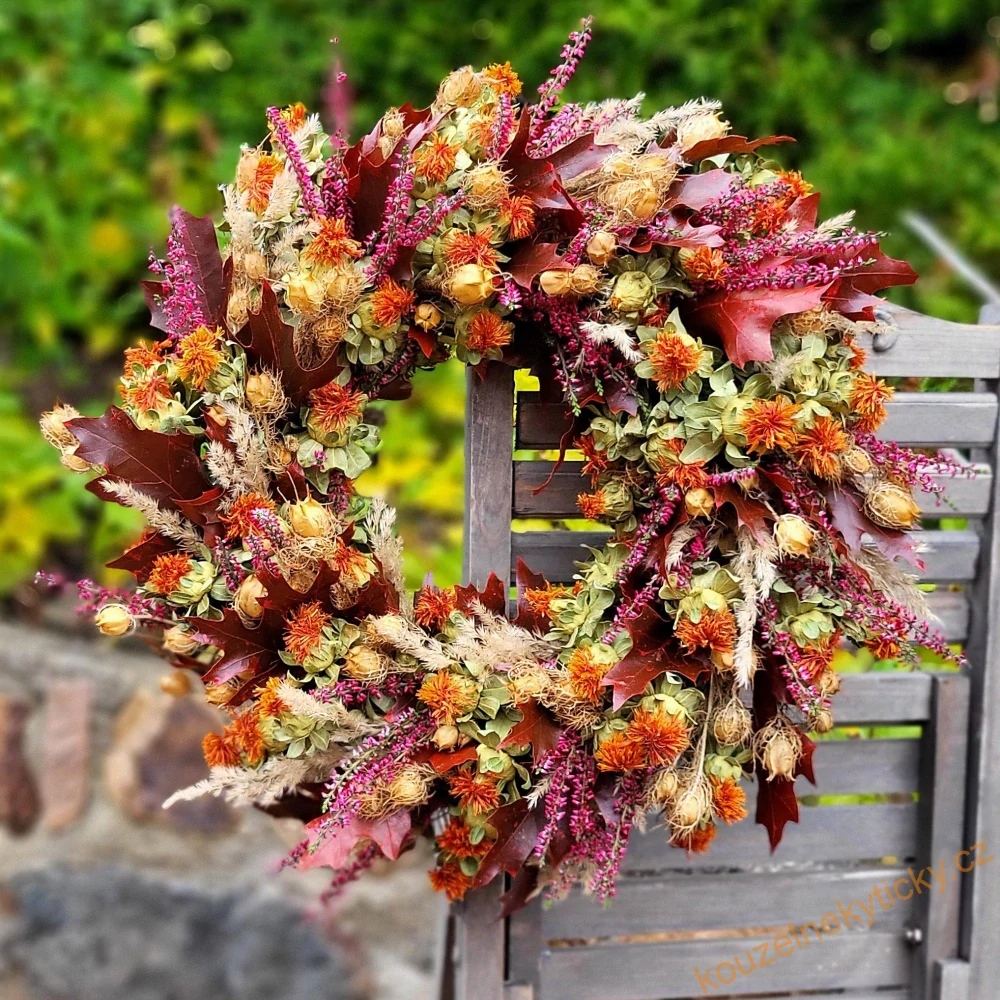 Věnec ze sušených kvítků . Průměr 38cm, má očko pro zavěšení. Bukové,vínové listy jsou na foto čerstvé, postupně seschnou, trochu se zkroutí, ale barva a tvar zůstanou.