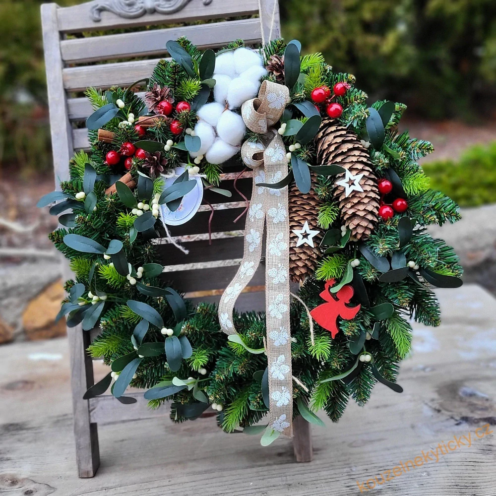 Věneček z umělé chvoje,vázaný na drátěný základ. Zdobený viz foto. Průměr 42cm.