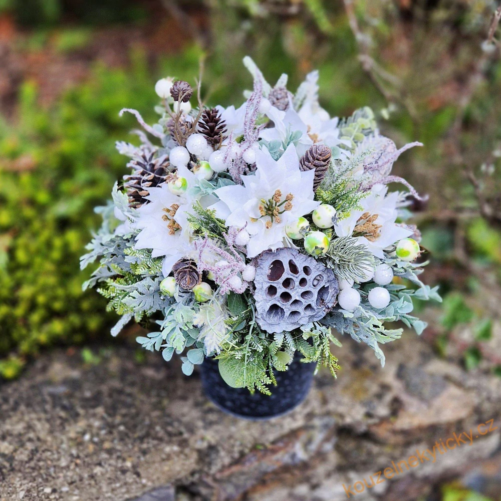 Vánoční dekorace v plechovém květníčku s motivem hvězdiček. Použity velmi kvalitní květy poinsettií, různorodá umělá zeleň , doplňky. Výška 30cm, šířka 30cm