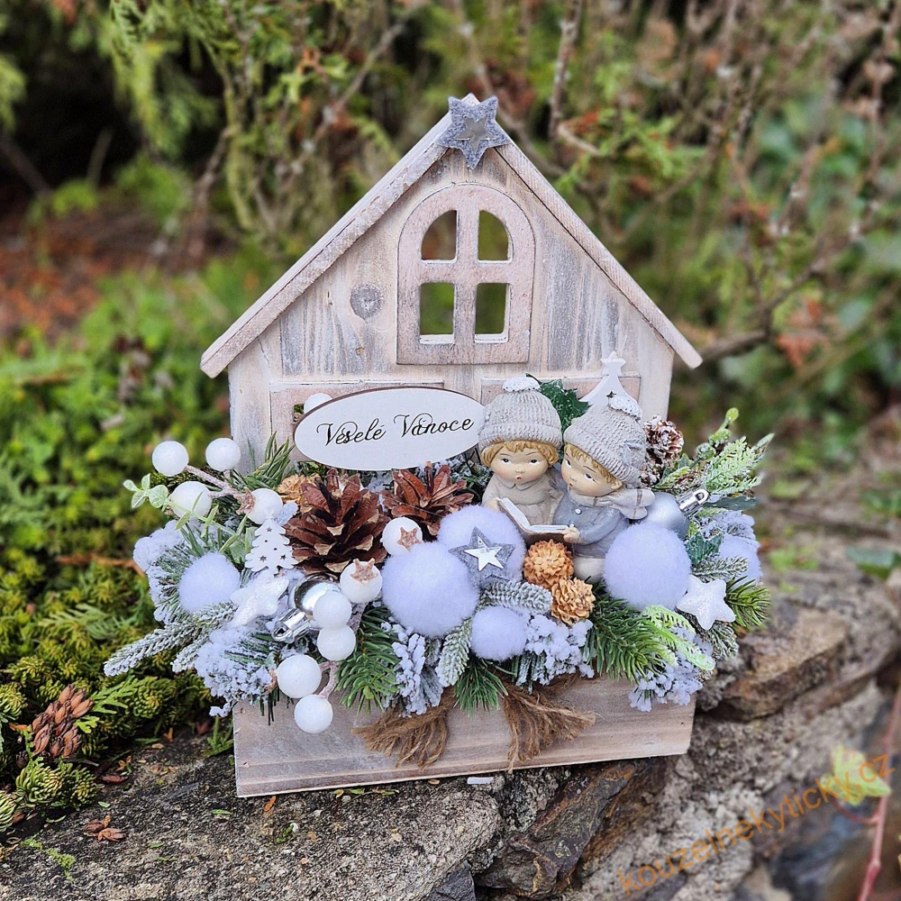 Dřevěný domeček, krásně zimně provedený, zdobený jako krajinka s příběhem.