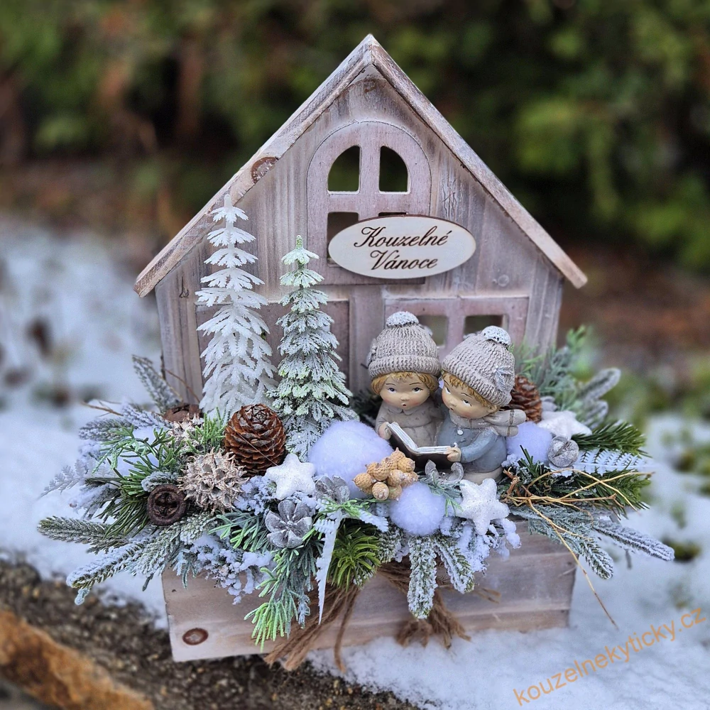 Dřevěný domeček, krásně zimně provedený, zdobený jako krajinka s příběhem.