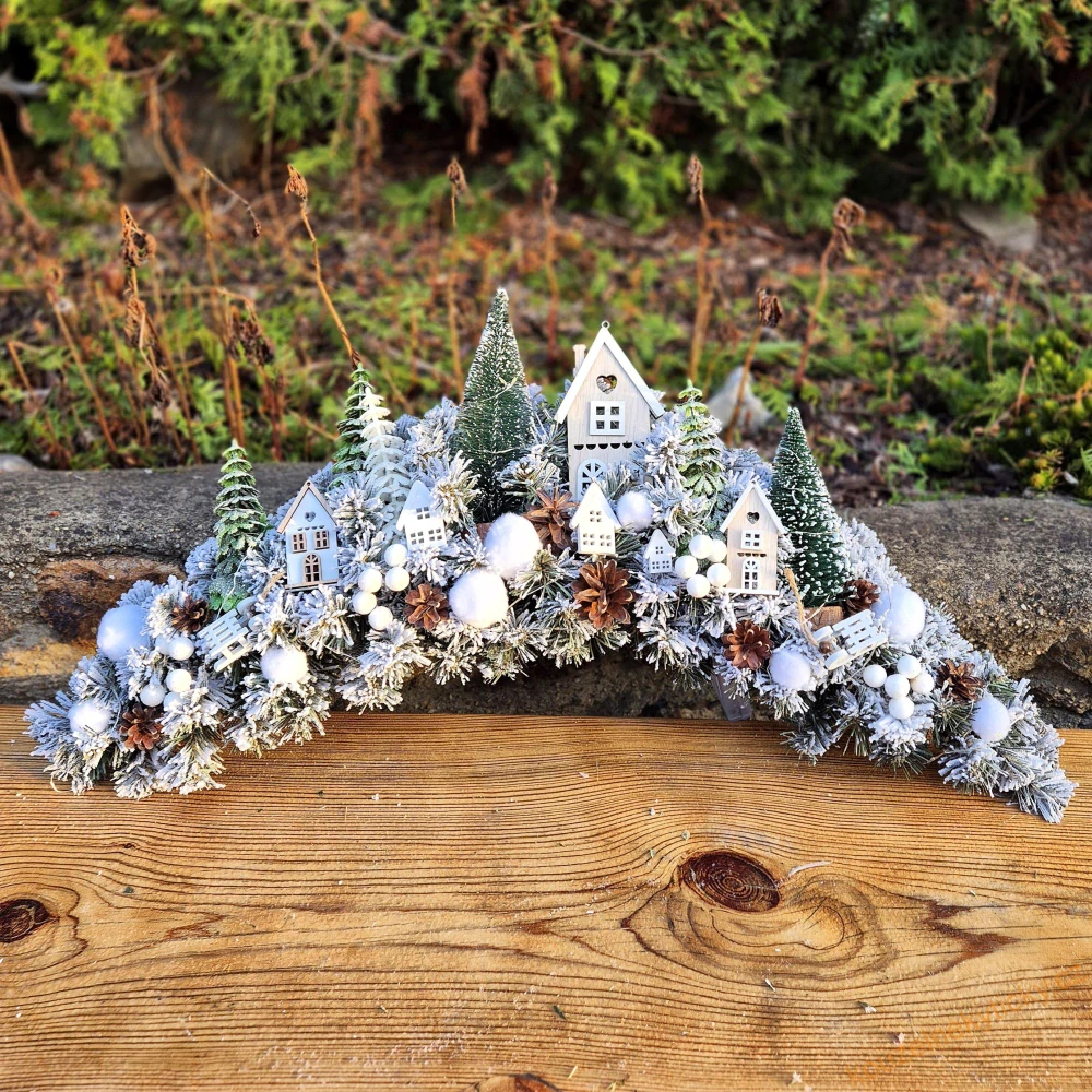 Vánoční oblouk, zasněžený , s domečky a doplňky. Šířka 70cm