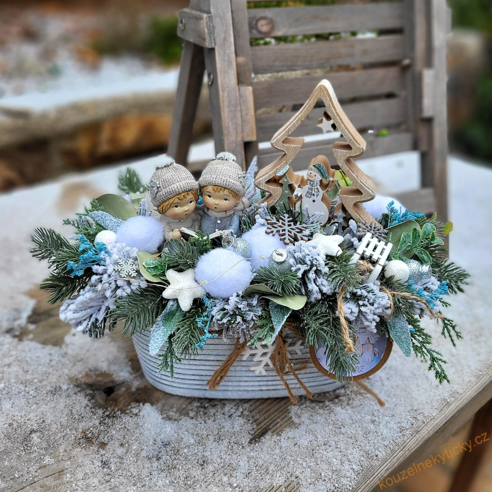 Plehový truhlíček s vločkou, zdobený umělou zelení, figurkami dětí, krásným dřevěným stromečkem a LED osvětlením.