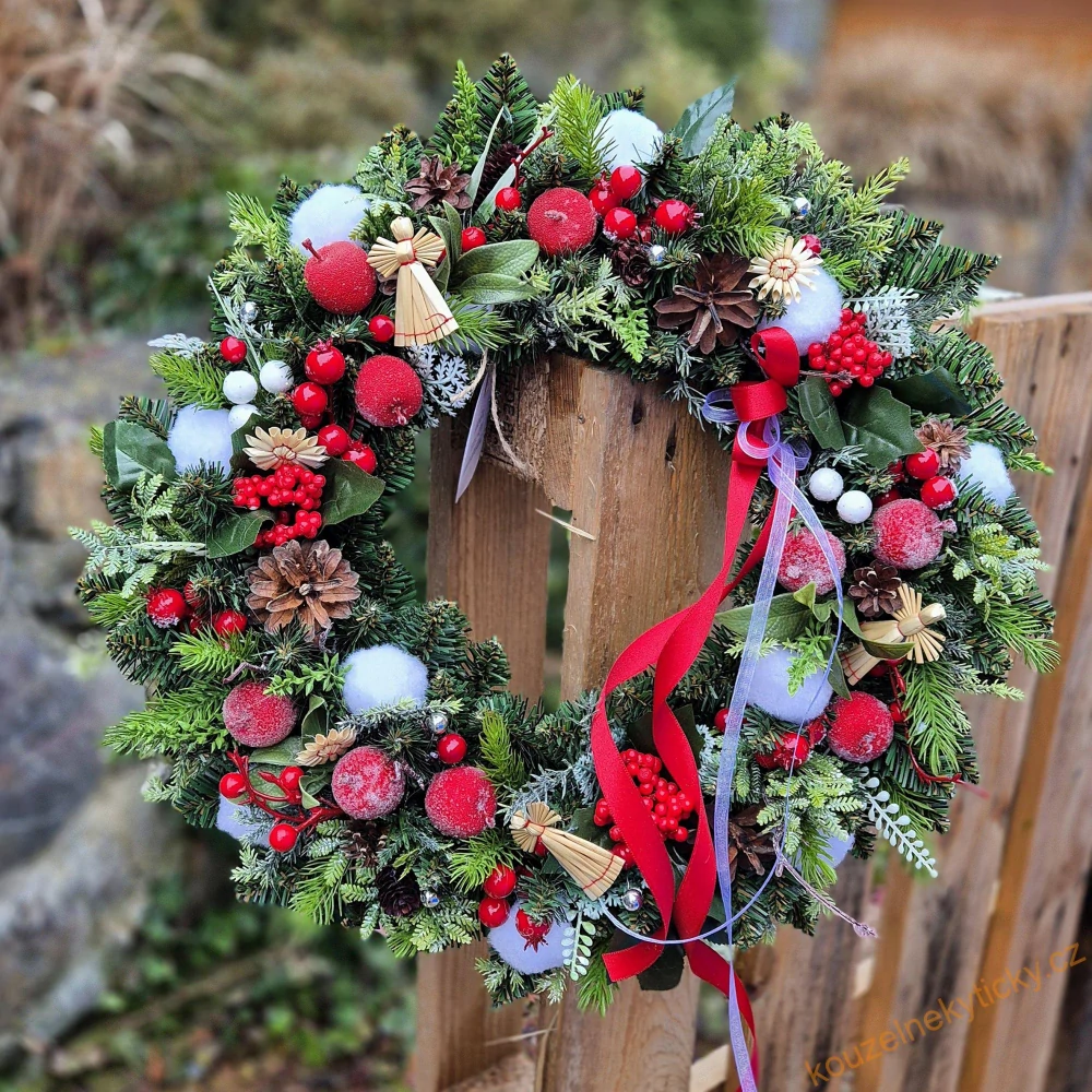 Věnec z různých druhů umělé chvoje, základ tvoří chvoj na drátěném základu , zdobený viz foto. Průměr 40cm. Věnec má očko pro zavěšení.