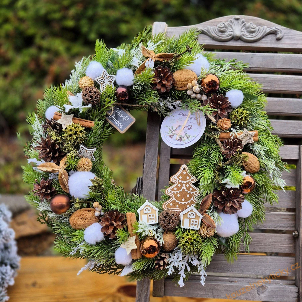 Věnec z různých druhů umělé chvoje, průměr 35cm. Zdobeno viz foto. Věnec má očko pro zavěšení.