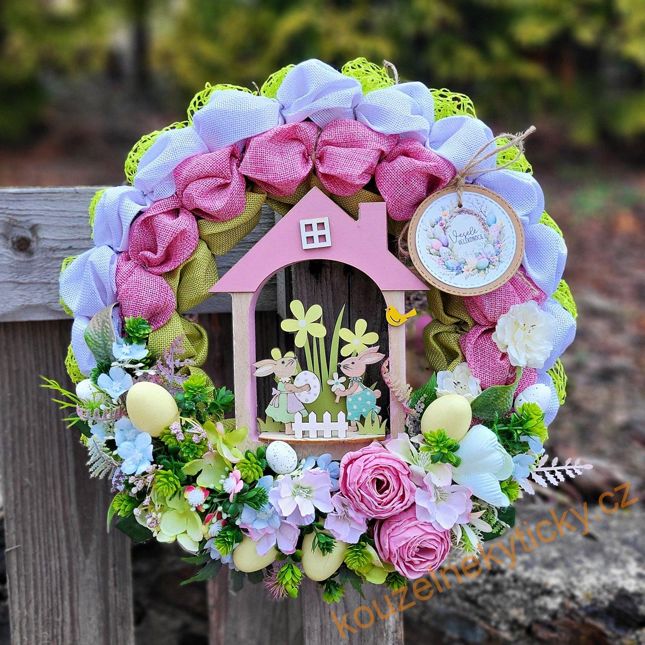 Velikonoční jutový věneček - Domek u zajíčků růž