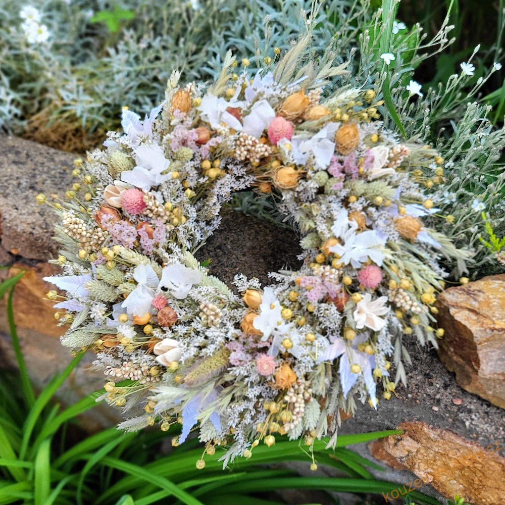 Přírodní věneček vázaný, sušený,vhodný na položení . Průměr 30cm, má očko pro zavěšení.