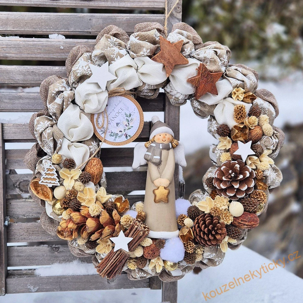 Zimní věnec juta/přírodniny - Andělka hnědá 1/2 zdobený
