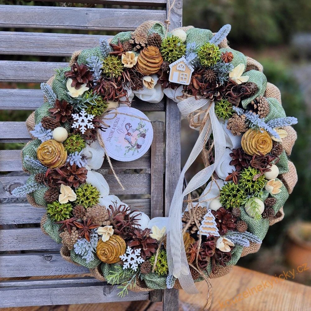 Zimní věnec juta/přírodniny - Vločky v trávě